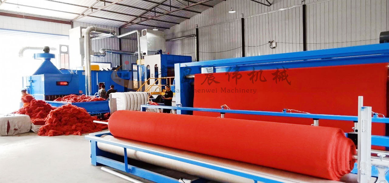 開包機(jī)-開松機(jī)-振動(dòng)給棉機(jī)-梳理機(jī)-鋪網(wǎng)機(jī)-針刺機(jī)-切邊成卷機(jī)