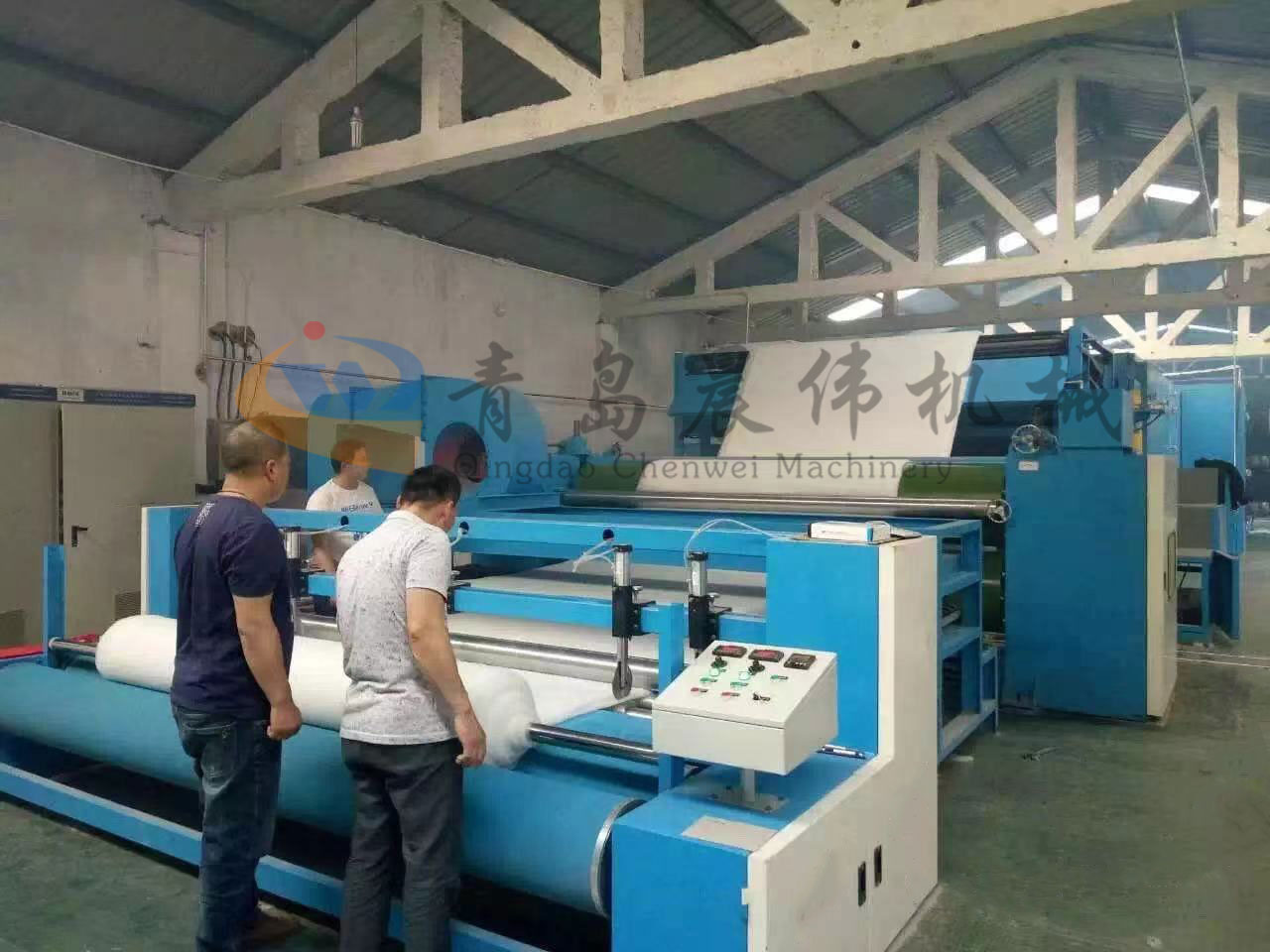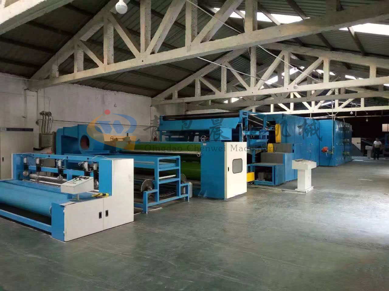 5. CWPW-鋪網(wǎng)機(jī):用于將梳理纖網(wǎng)通過移動小車交叉折疊為所需幅寬和定量的多層纖網(wǎng),以供后道工序使用。鋪網(wǎng)輥采用特殊結(jié)構(gòu),加裝壓網(wǎng)輥和導(dǎo)流板,不飄網(wǎng)不起皺,五只大功率電機(jī)精確控制各部件的運動,電動輸出簾高度調(diào)節(jié)裝置。