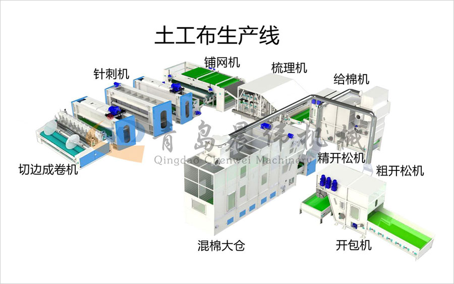 開包機(jī)-開松機(jī)-振動(dòng)給棉機(jī)-梳理機(jī)-鋪網(wǎng)機(jī)-針刺機(jī)-切邊成卷機(jī)